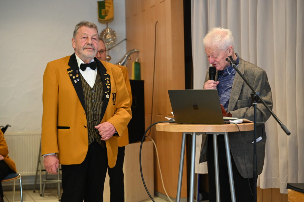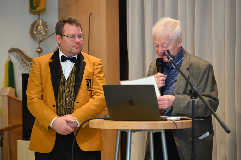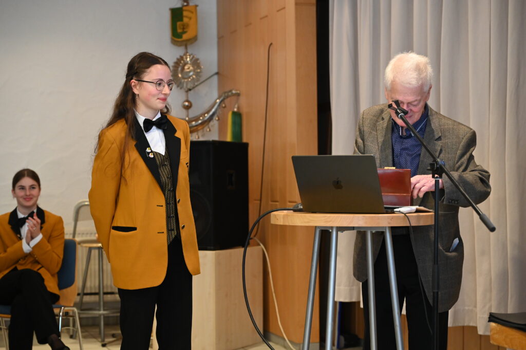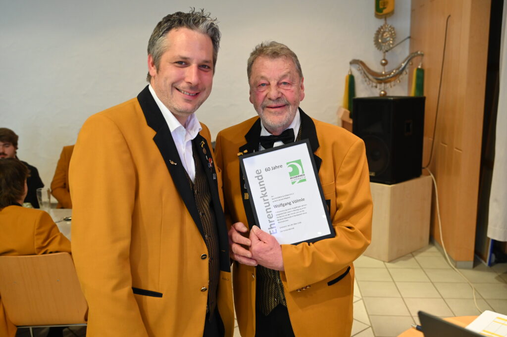 Und schließlich durfte sich Wolfgang Völmle über eine Ehrennadel in Platin mit Diamant und Urkunde für 60-jährige aktive Tätigkeit am Flügelhorn freuen. Wolfgang Völmle ist seit 1966 aktives Mitglied im Musikverein Schönaich. Er hat das Musizieren vom Vater in der Waschküche gelernt. Außerdem war er einer der ersten Musiker der ersten Jugendkapelle des Vereins. Von 1995 bis 2025 war er zudem zweiter Vorsitzender bzw. Vorstand Musik. Mit seinem Einsatz und Engagement ist er für alle Musikerinnen und Musiker ein echtes Vorbild.